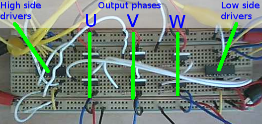 The left driver gates the high-side outputs (top 3 MOSFETS) and the right driver gates the low side (bottom 3 MOSFETS).