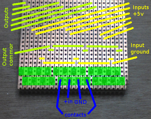 Above is the breadboard assembly of the opto isolator drivers and MOSFET outputs.