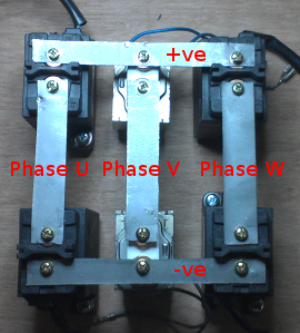 Relays connected in a 3-phase bridge with some purpose made bus bars.