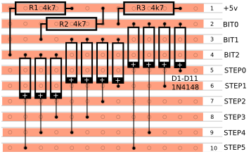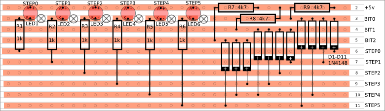 Since the relays are not a one-to-one with reed switches we need to introduce a diode matrix.
