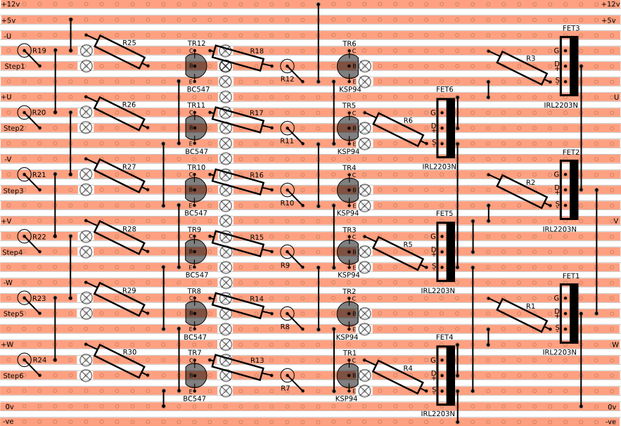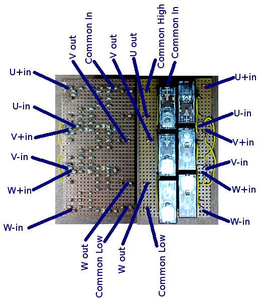 Before the solid state version was tested, as an intermediate step, the relays were used to driver the motor from the hall sensors:
