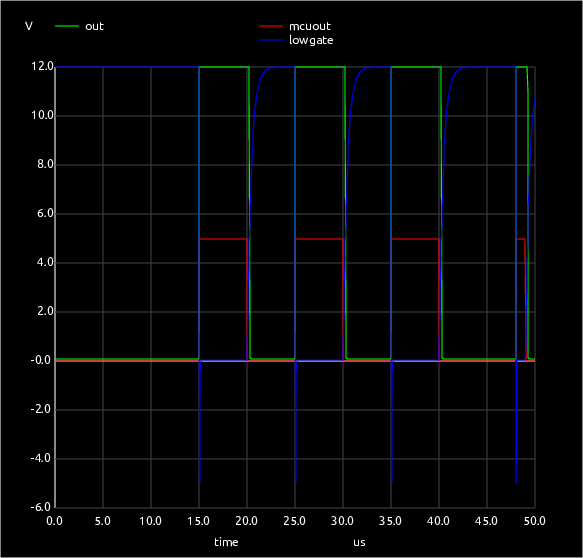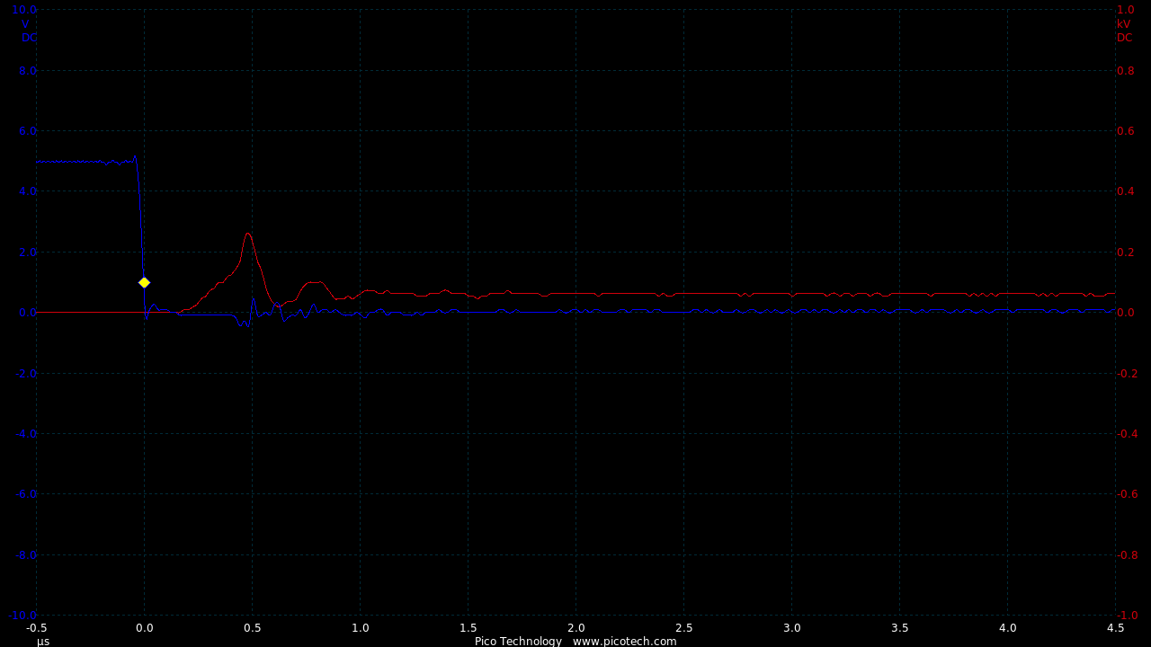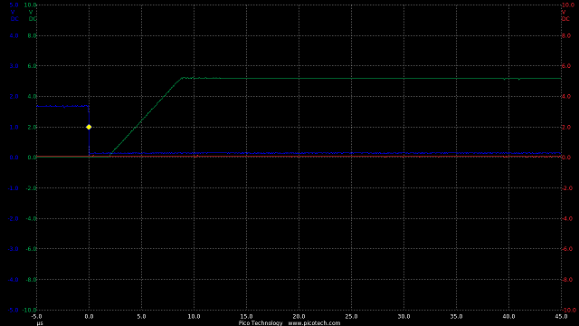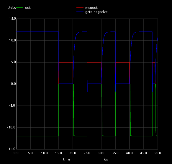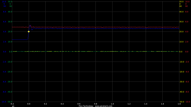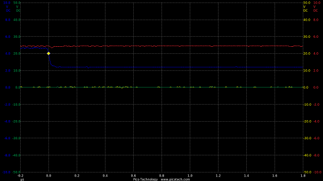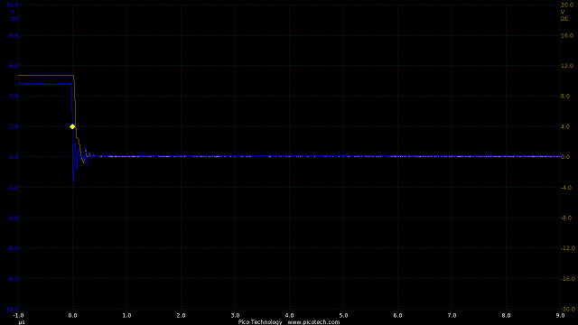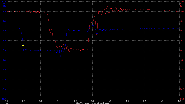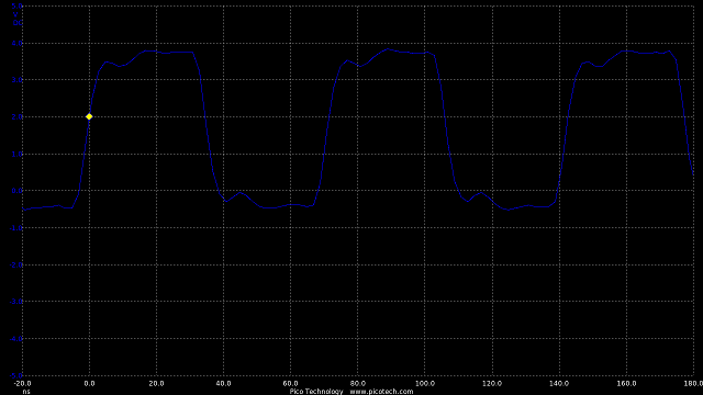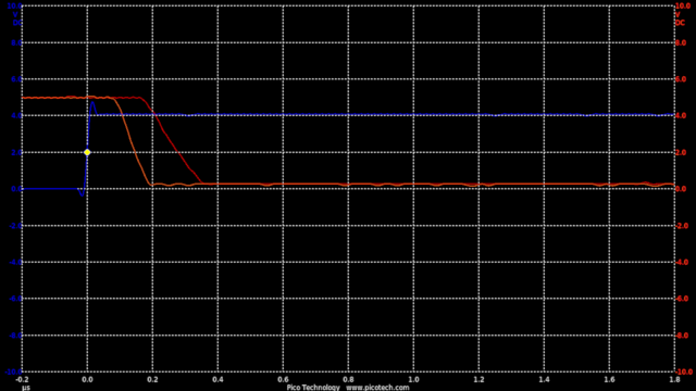 In the circuit a 10k resistor added means the rise and fall times are now roughly equal at 200nS