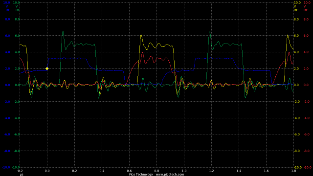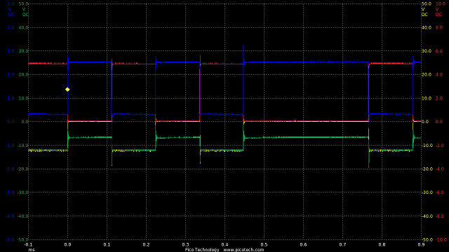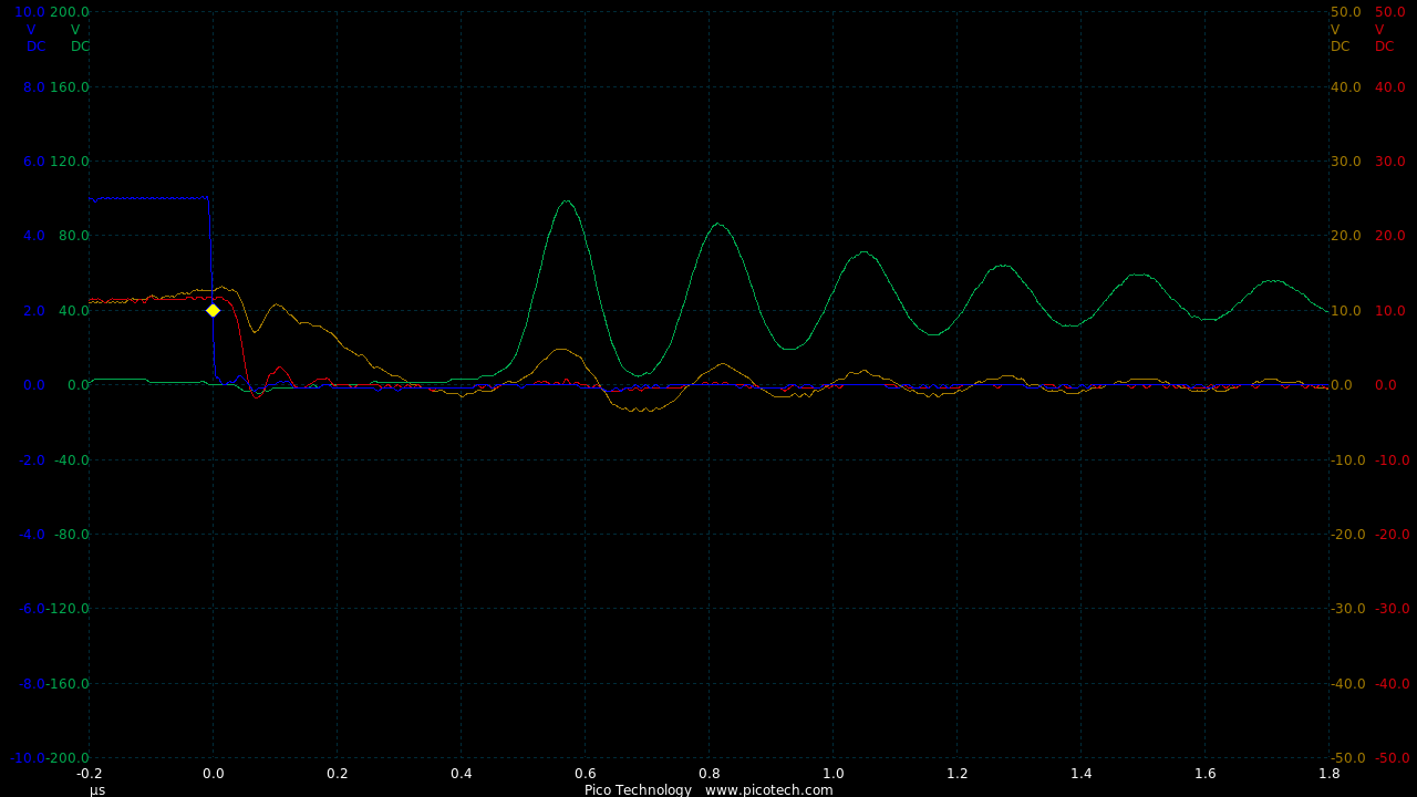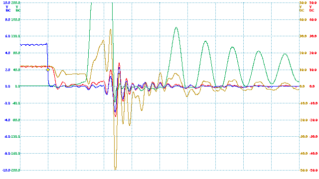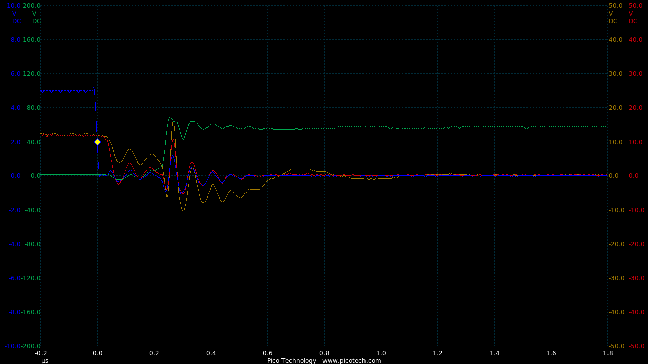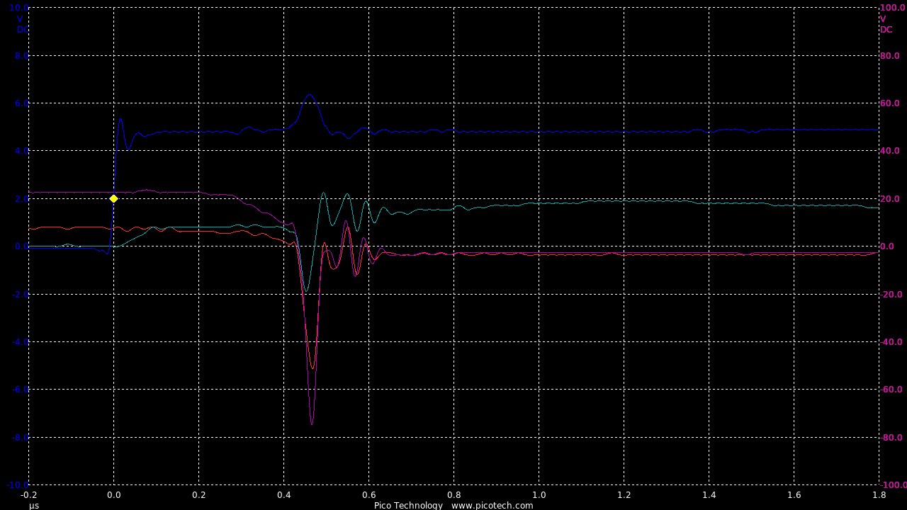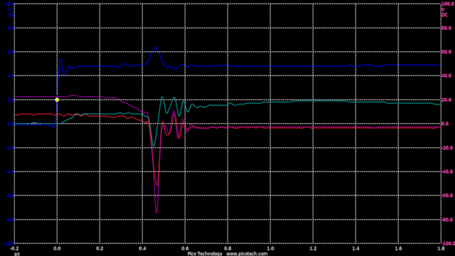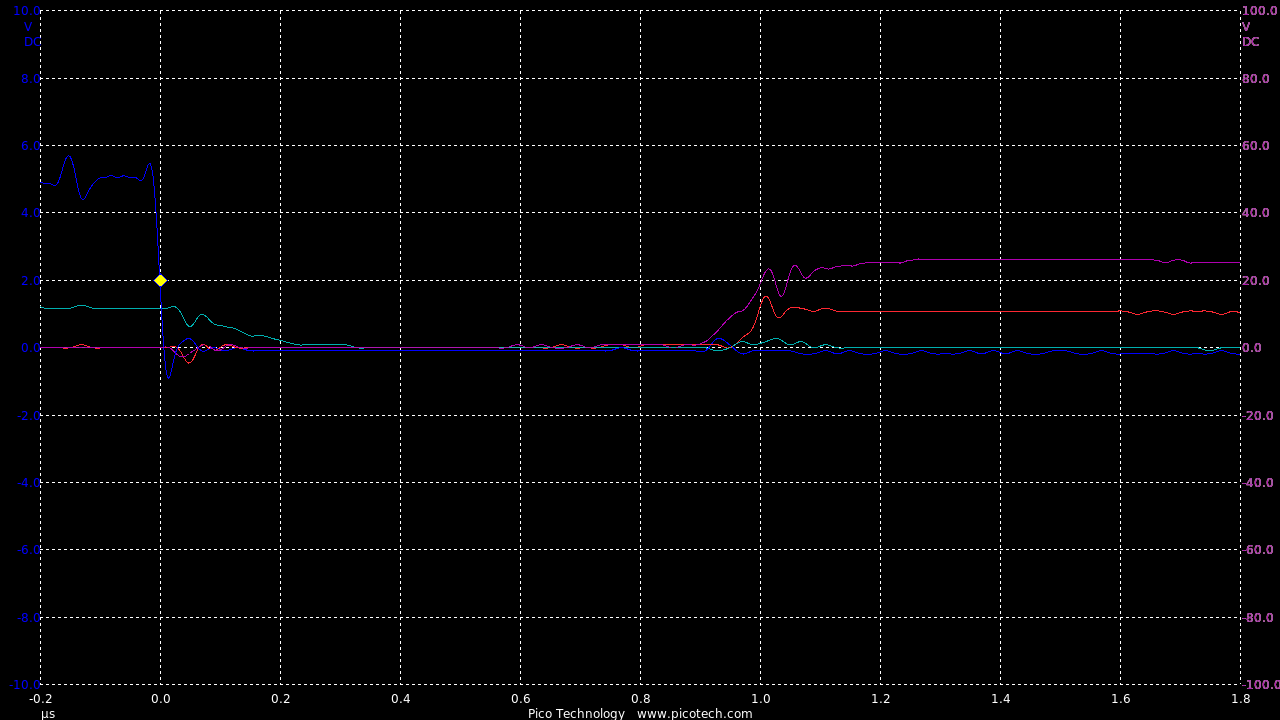 TIME:200nS/div, Blue:TP1(2vDC/div), Red:TP5(20vDC/div), Magenta:TP3(20vDC/div), Cyan:TP4(20vDC/div).
