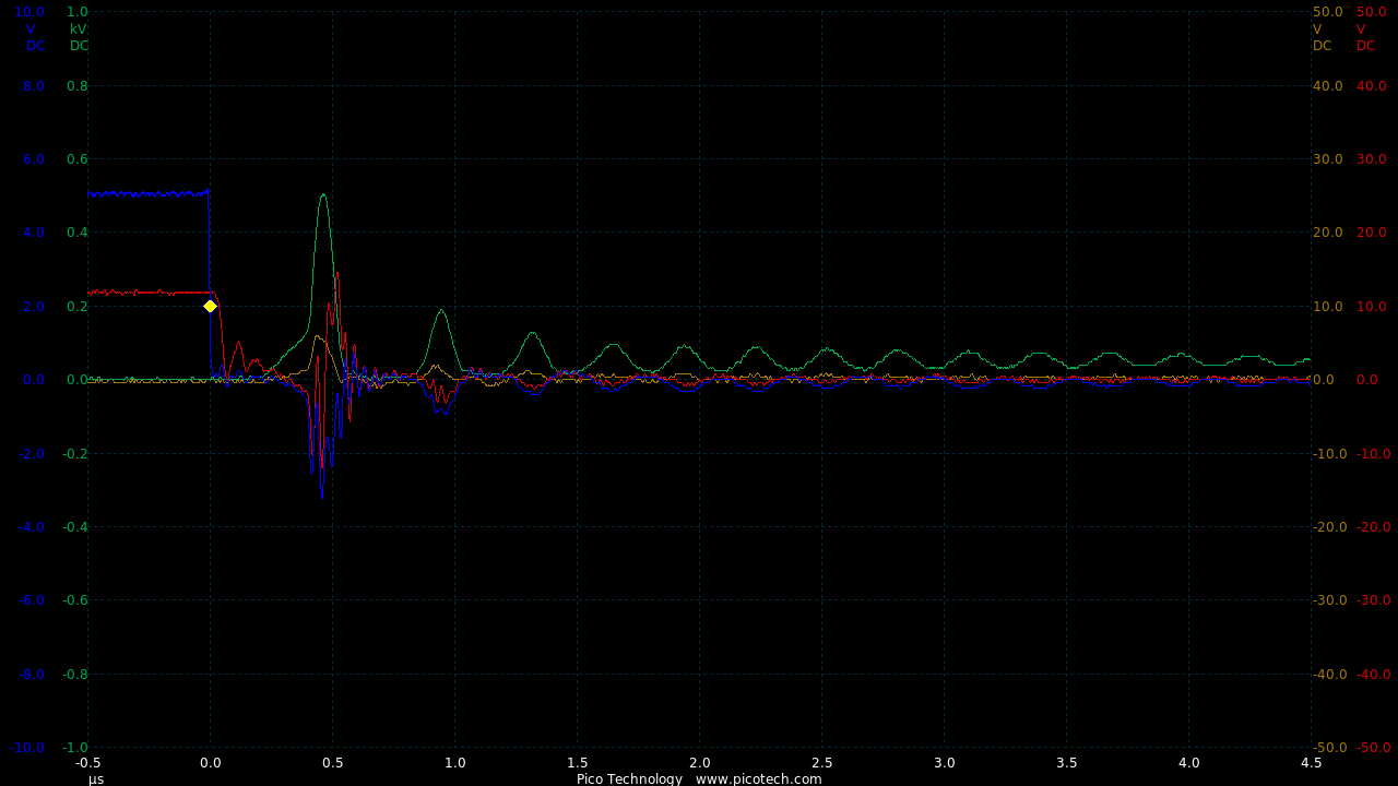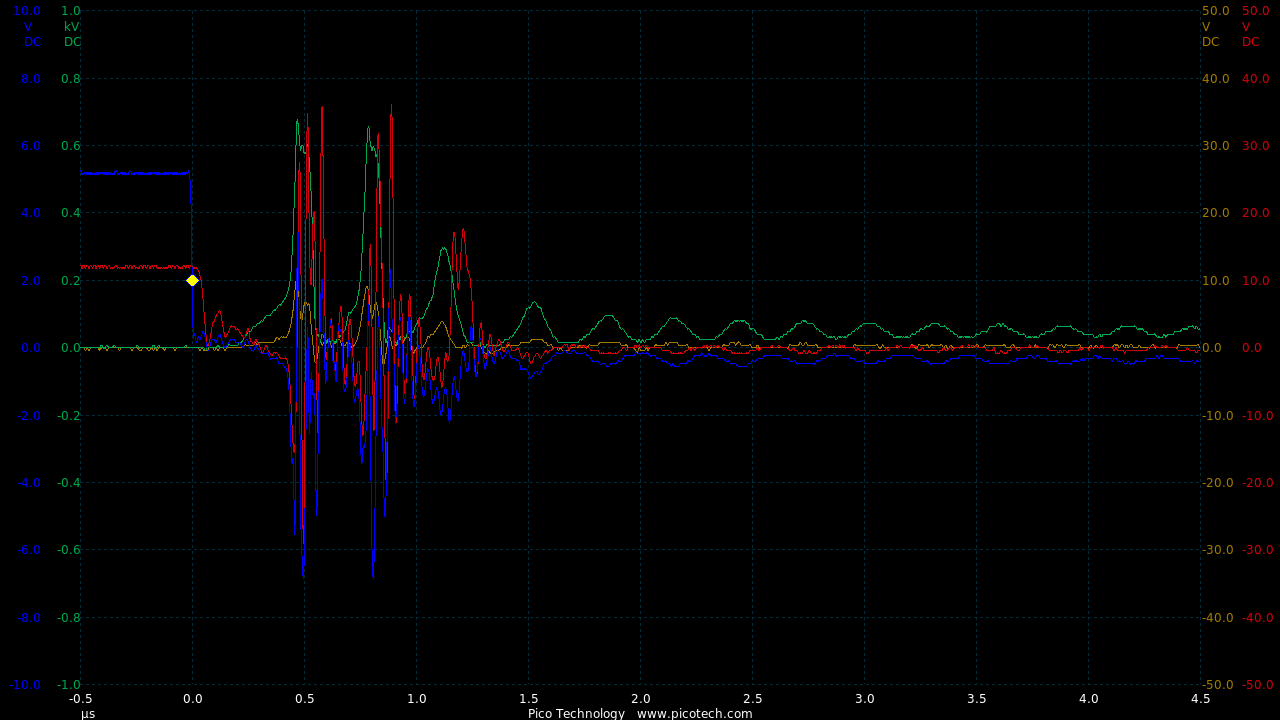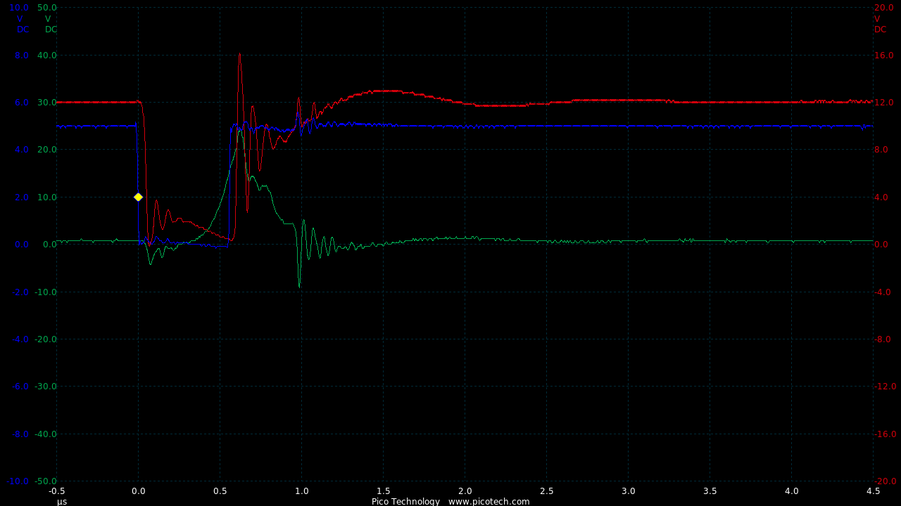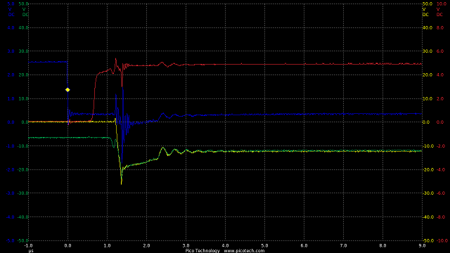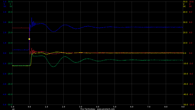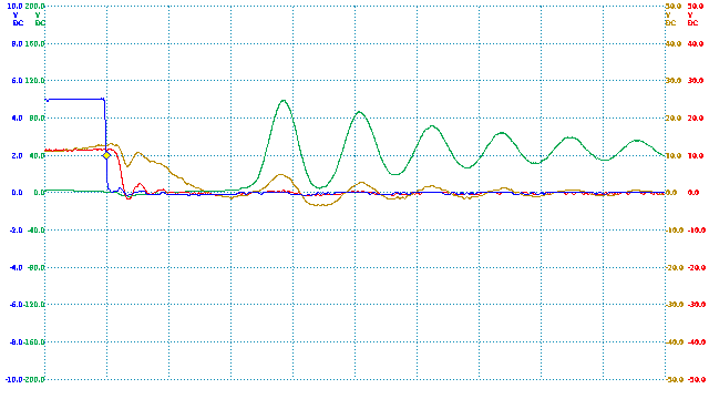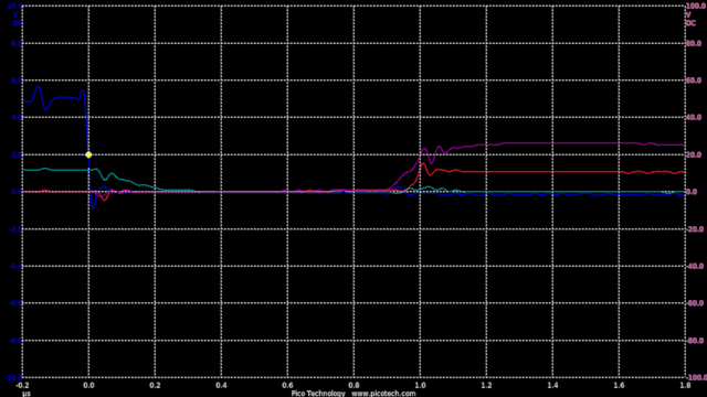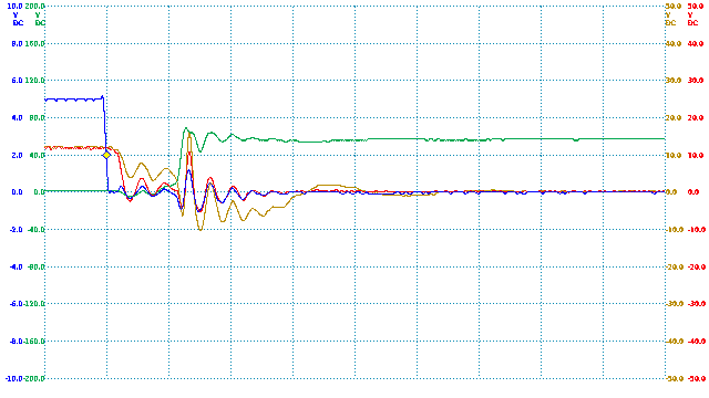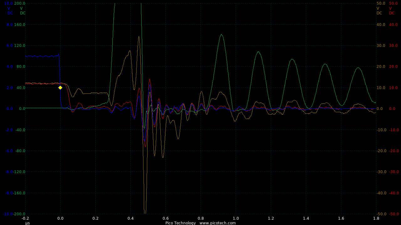 TIME:200nS/div, Blue:TP1(2vDC/div), Red:TP5(20vDC/div), Magenta:TP3(20vDC/div), Cyan:TP4(20vDC/div).