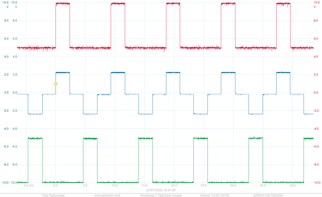 Checking V-phase Motor input (PWM ~4kHz, field rotation ~1kHz)