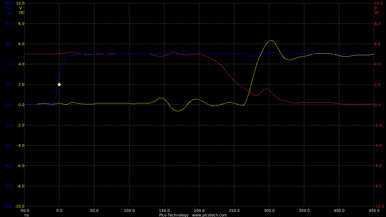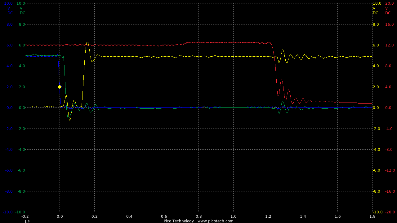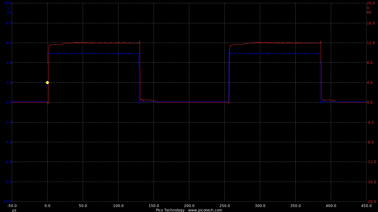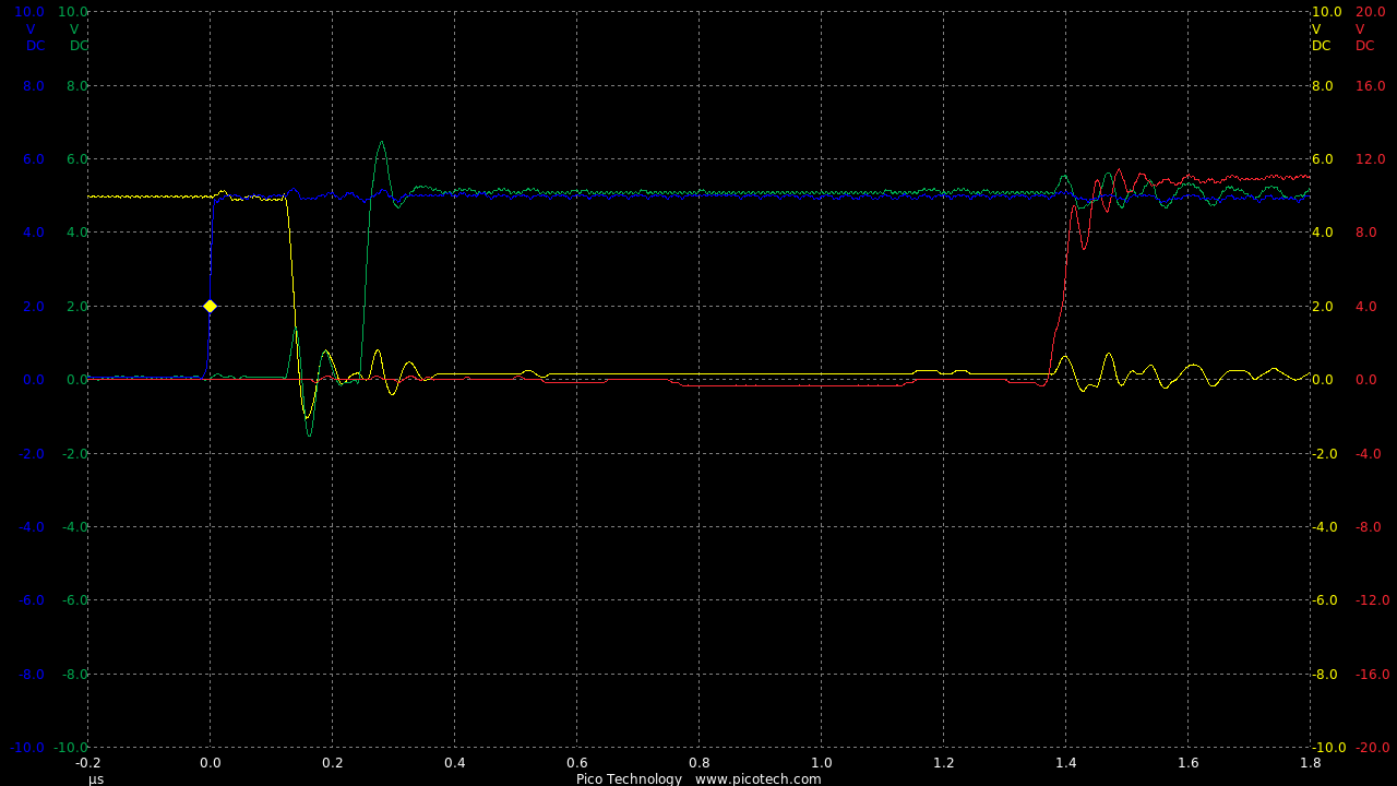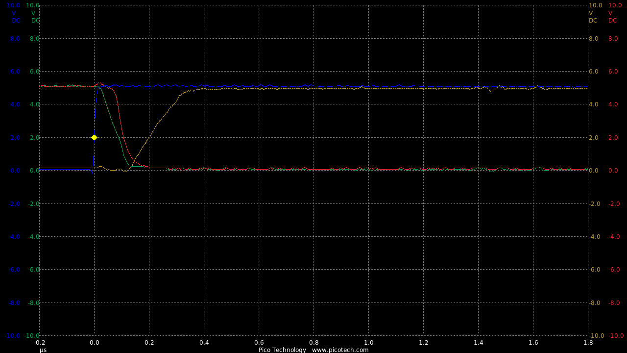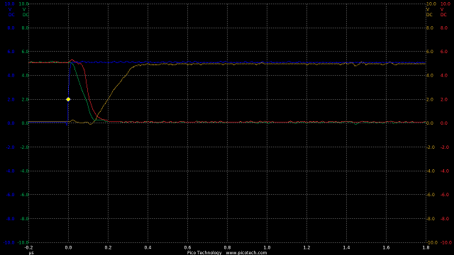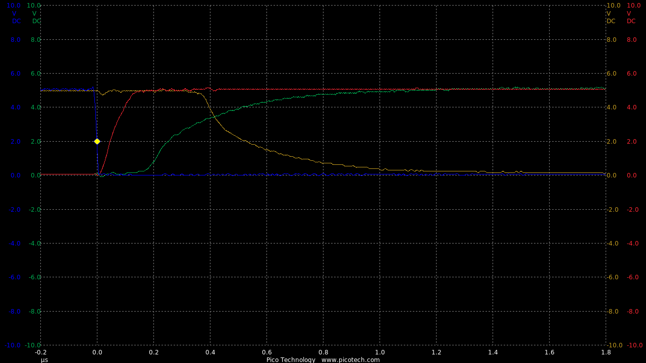 Now we are seeing speeds much closer to the theoretical RC circuit of the 1k charge resistor and gate capacitance.