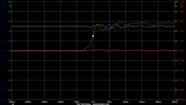 TIME:200uS/div, Blue:MCU V-phase(2vDC/div), Red:MCU W-Phase(2vDC/div), Green:MCU U-Phase(2vDC/div), Yellow: Motor V-phase(4vDC/div).