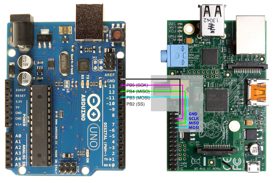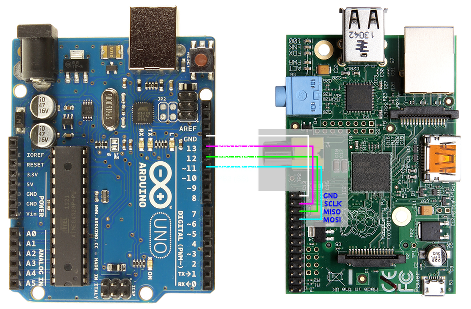 Since both AVR and BCM chips have SPI bus a Arduino<->Pi test was done.